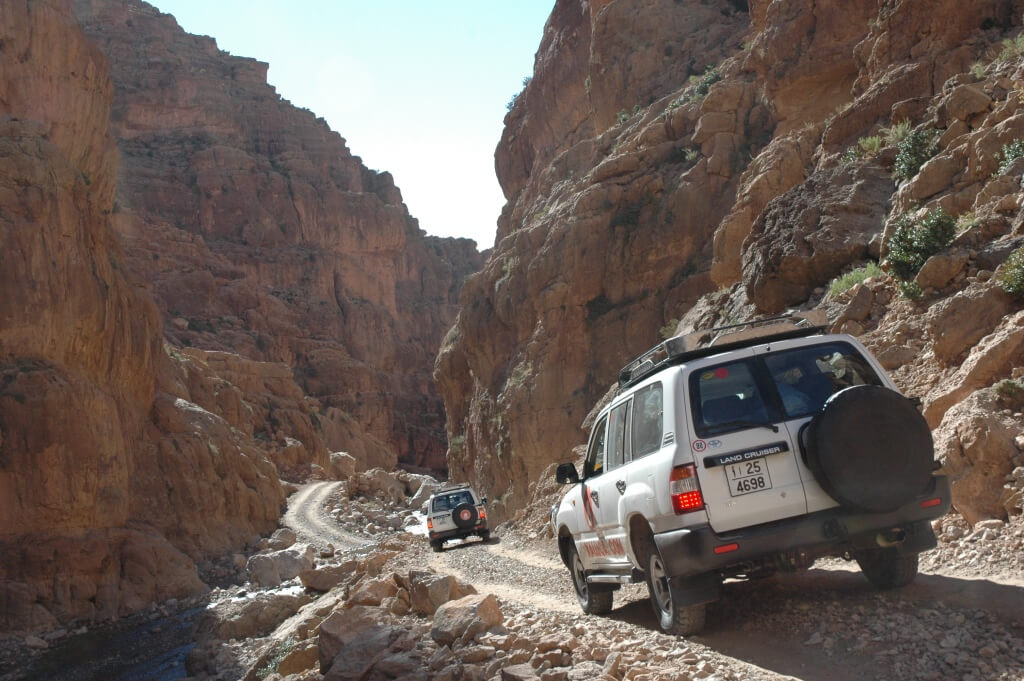 Desayuno. Salida a las ocho de la mañana en el punto más cercano a vuestro alojamiento- Nos dirigiremos a Demnate donde comenzaremos a subir hacia las montañas del Atlas. Al llegar a Iminifri pararemos para visitar andando el impresionante puente natural que allí se encuentra. Hay que bajar unas largas escaleras y pasar por debajo de la gran oquedad que es una maravilla, aunque hay que trepar ligeramente en algún punto y luego subir unas pocas escaleras para regresar al vehículo, desde luego, una excursión preciosa y que muy pocos hacen por no ser nada conocido. Si alguien no quiere andar, puede esperar en el coche tranquilamente. Disfrutando de la belleza de la naturaleza tan imponente que nos muestran estas montañas, atravesaremos tres puertos con sus valles totalmente distintos los unos de los otros, llegaremos al valle del Tassout. La comida será un estupendo, tradicional y artesanal cus cus. No vais a comer un cus cus semejante en todo Marruecos a lo largo de nuestro viaje. Visitaremos el pueblo de Magdaz, con sus kasbash de piedra, algunas tienen más de 300 años. Seguiremos por carretera, es posible que esté quebrada por ríos y nieves, pero podremos pasar sin problemas. El descenso nos llevará hasta la gran llanura y seguiremos Hasta Skoura, Nos alojaremos en la kasbah Ait Ben Moro y será un magnífico lugar para pasar la primera noche de nuestro viaje buscando el sur. Desde su azotea tendremos una fantástica vista de Skoura.