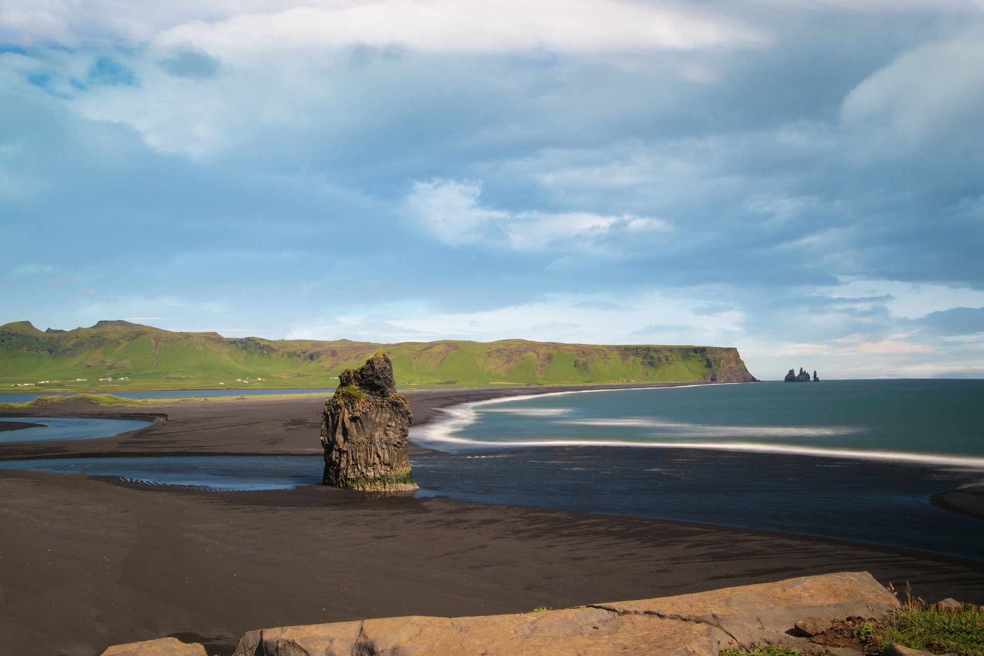 Recogida del coche de alquiler. En esta jornada exploramos los hitos del famoso “Círculo de Oro”. Atravesando la suave campiña islandesa penetramos en la región sur y alcanzamos la elegante cascada cola de caballo Seljalandfoss, con una altura de 60 metros. Tras caminar por el sendero que la rodea y refrescados por el vapor de agua, conducimos 30 km más para llegar una de las más bellas cascadas de Islandia, Skogafoss, una compacta cortina de agua entre un verde farallón. Finalizamos la jornada en Vik, pequeña localidad costera, no sin antes haber ascendido al imponente promontorio de Dyrholaey y pisado las arenas negras de la playa de Reynisfjara, con sus cuevas, columnas basálticas y caprichosas formas rocosas.